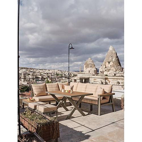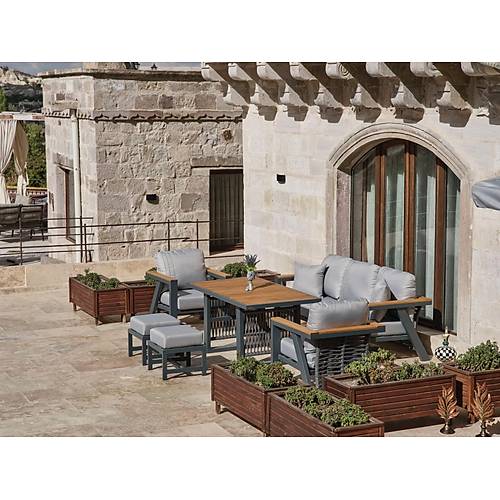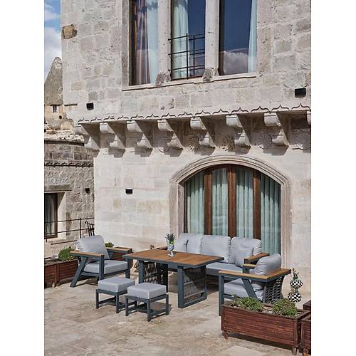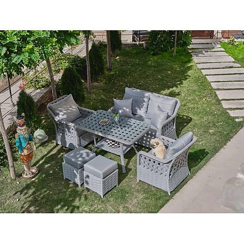 Fiyata dahil parçalar; 1 Adet 3’lü Koltuk, 2 Adet Tekli Koltuk, 2 Adet Puf, 1 Adet Yemek Masası Genel Ürün Özellikleri ; Rattan ürünlerde kullanılan çiviler geri atma , çıkma yapmaması için tırtıklı ve dişli seçilmektedir. Alüminyum ürünlerde dayanıklı ip ve elektrostatik toz boya kullanılmakta. Ahşap kısımlar iroko ağacıdır. * Paslanmaz * Soğuğa ve sıcağa dayanıklı * Darbelere karşı dayanıklı * Güçlendirilmiş alüminyum şase * Düşük yoğunluklu polietilen * Ultraviyole koruma * Leke tutmaz silinebilir kumaş (Yıkanabilir) * Kötü hava koşullarına dayanıklı * Haşere ve mantar tutmaz * Tamamen yıkanabilir * Geri dönüştürülebilir